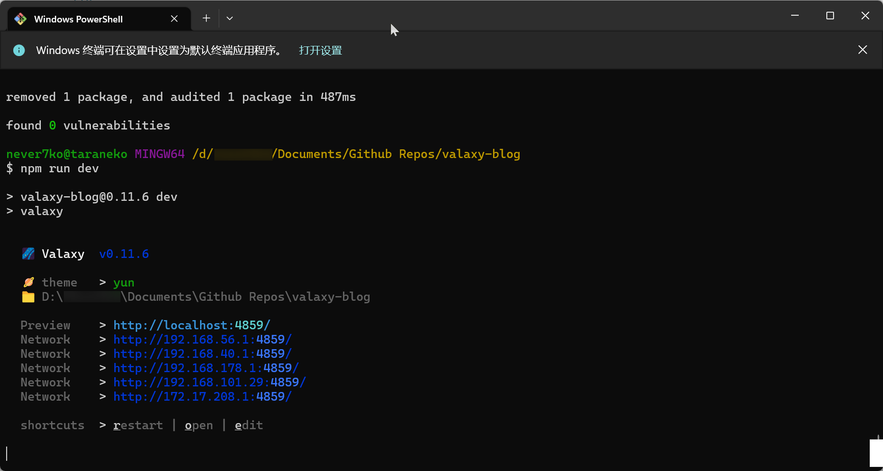 按照文档里所说,更推荐使用 pnpm create valaxy,可使用 npm i -g pnpm 安装 pnpm